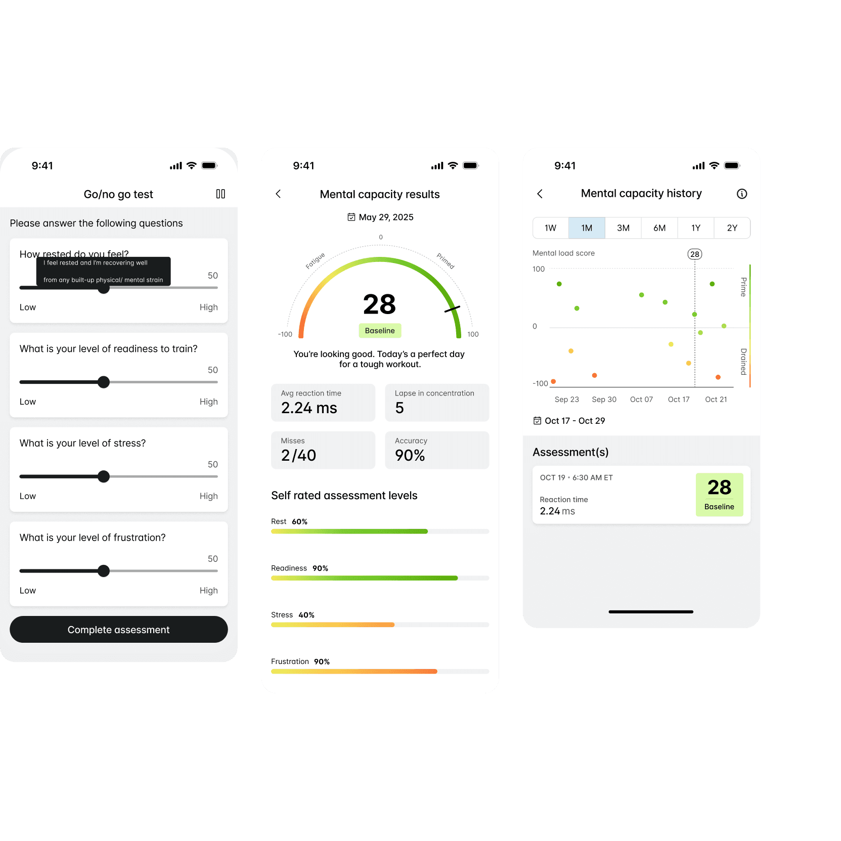 I led the design of Fitness Mental Assessment, a concept built to explore how mental readiness could become part of the product experience. The goal was to create something simple, measurable, and approachable. A lightweight interaction that could help users reflect on their state before training and better understand how mindset might influence performance.